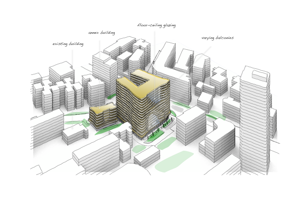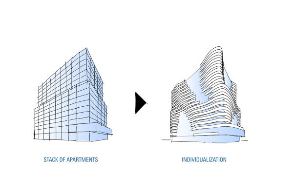 With an FAR (Floor Area Ratio) of 5.0 and many limiting conditions, a U-shaped floor plan manifested itself as optimum. The program required 400 apartments of 45-110 m2 in size, which could result in a staggering mass of identical units; to prevent this, variety and diversity is created by manipulating the balconies around the building.